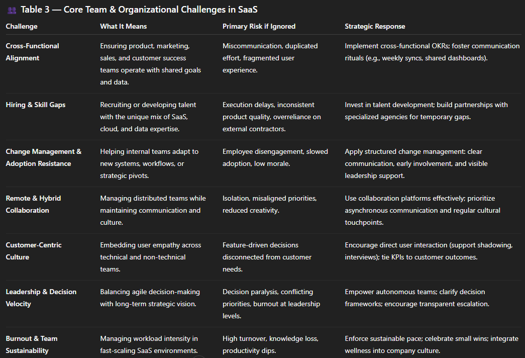 Then comes change management. SaaS moves fast, but people don’t. Rolling out new tools or processes without empathy leads to fatigue, resistance, and eventual disengagement. The best teams treat internal adoption like customer onboarding: communicate early, train continuously, celebrate wins.