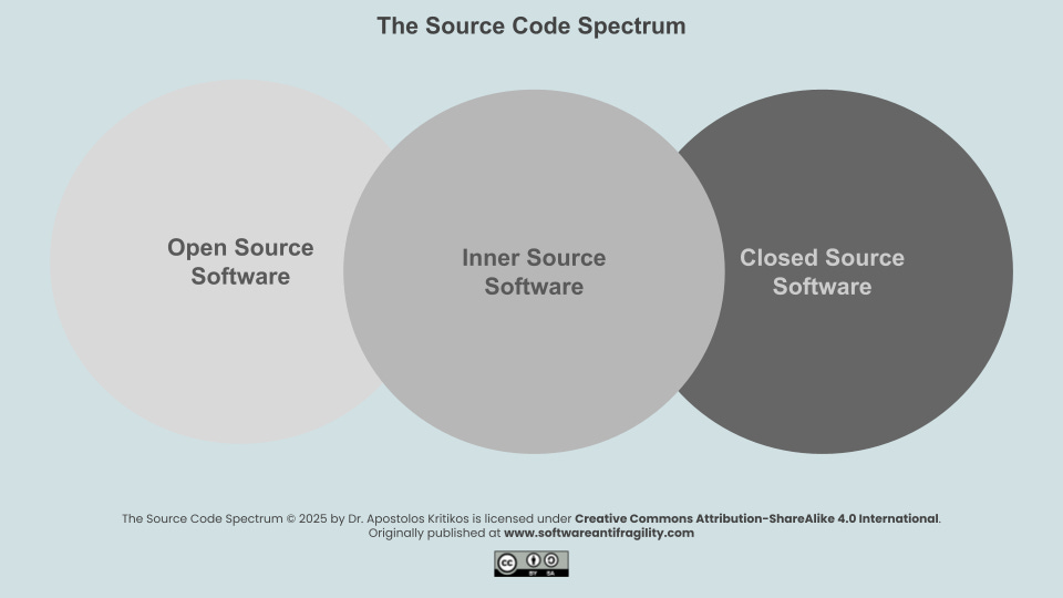 There is software out there that can be classified either as Free / Open Source or as Closed Source. Lately a new term, Inner Source Software, has been introduced but we will get to that later. The important thing is that the aforementioned classifications of software forms the Source Code Spectrum.