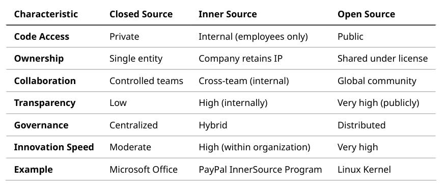Inner Source Software Development applies open-source principles within an organization. Code is accessible to all employees, encouraging cross-team collaboration while maintaining company ownership and intellectual property rights. Transparency is high internally, as documentation, reviews, and discussions are shared across teams. Governance follows a hybrid approach; open contribution with internal oversight. This model accelerates innovation and knowledge sharing within large organizations. PayPal’s Inner Source program is a notable example.